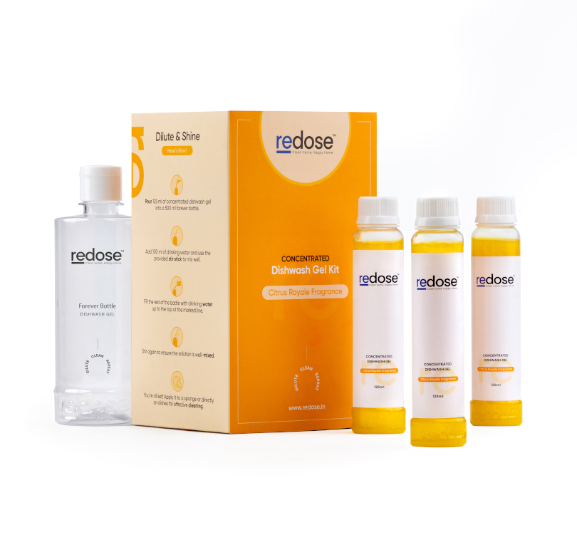Redose Dishwash Gel Kit with refreshing Citrus Royale Fragrance is a powerful, grease-cutting solution that removes tough stains, oil, and food residue with ease. Just a few drops create rich foam, making it long-lasting and economical. Safe for all utensils and gentle on hands, it leaves dishes sparkling clean with a zesty citrus scent. Perfect for those searching for the best dishwash liquid, kitchen grease remover, or fragrant dish cleaner.